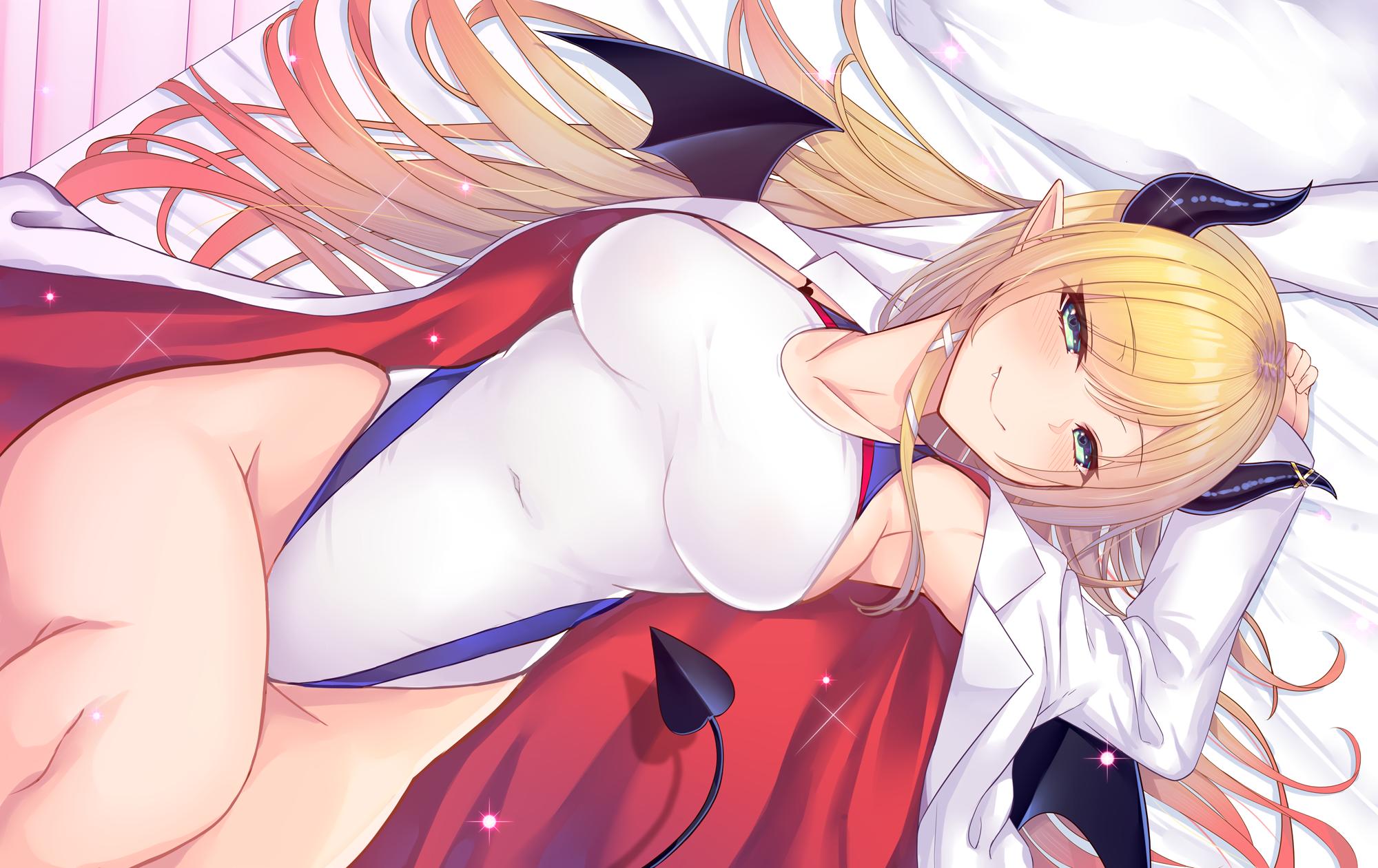 aqua eyes bed blonde hair close demon fumihiko (fu mihi ko) hololive horns long